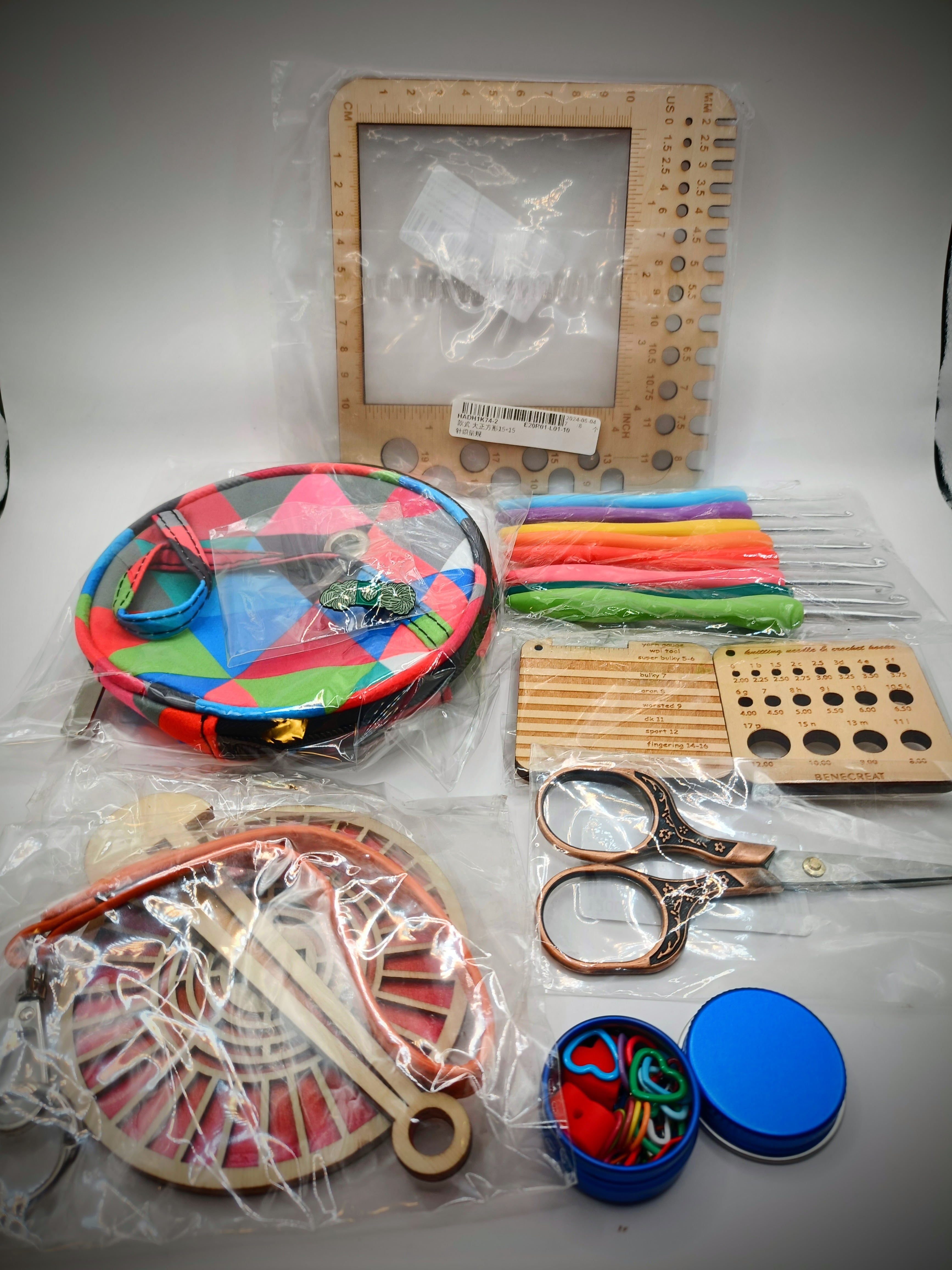 毛糸や小物を整理できる収納ポーチ付きで、持ち運びにも便利です。