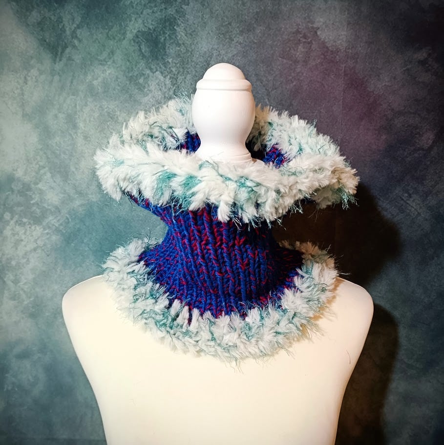 いろんな毛糸を引き揃えて銀河の星のようにいろんな色が散りばめられたスヌードです。